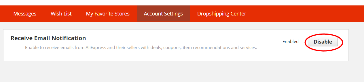 Přihlaste se na účet Aliexpress a přejděte na Můj AliExpress (My Aliexpress) – Účet (Account Settings) – Oznámení e-mailem (Receive Email Notification) a kliknutím odhlásit (Disable) odběr potvrdíte svoji volbu. Viz obrázek níže.
