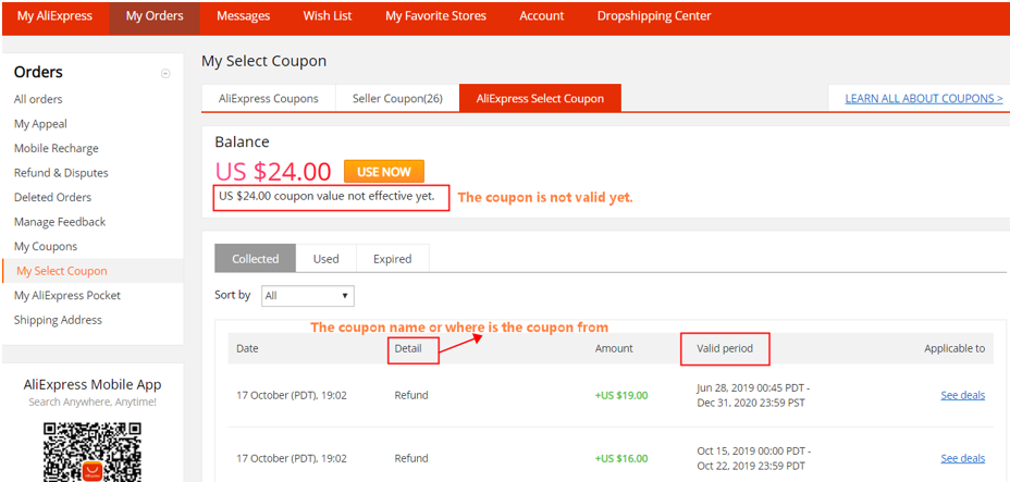 1. Kupon již není platný. Chcete-li to zjistit, přejděte na Můj AliExpress>Můj Select Coupon
