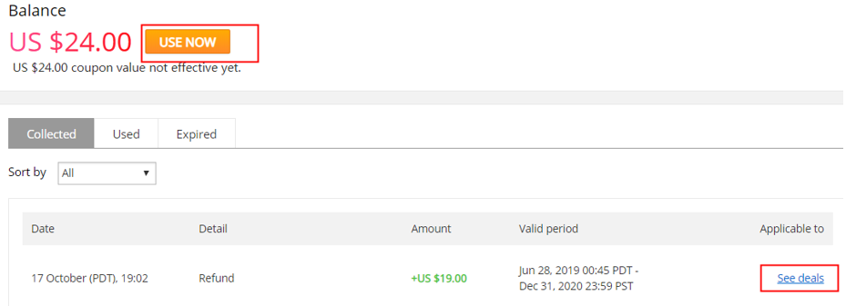 Vybrané kupony můžete použít pouze na určité položky z vybraných obchodů. Chcete-li zjistit, které položky, klikněte na See deals nebo USE NOW.