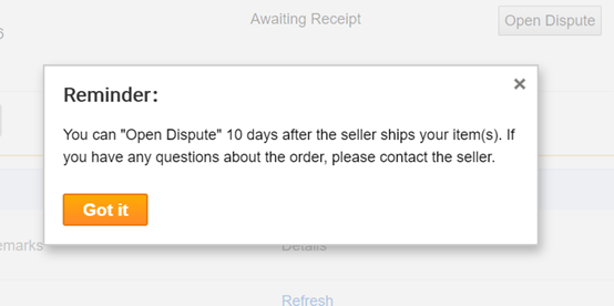 Spor můžete otevřít 11. den po odeslání vaší objednávky prodejcem a do 15 dnů od dokončení objednávky. Pokud ochranná lhůta kupujícího vypršela, kontaktujte prosím prodávajícího, domluvte se s prodávajícím za účelem dosažení dohody.